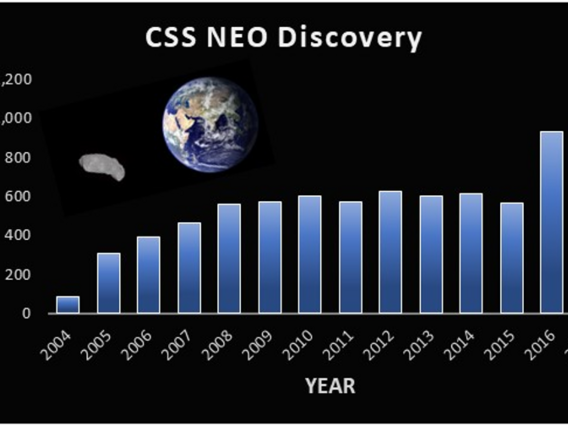 Image CSS Presents Advances at the 2017 AAS Planetary Sciences Meeting Oct. 23, 2017 Telescope and surveying advances at the Catlaina Sky Survey have dramatically increased Near-Earth object (NEO) discoveries. Read more