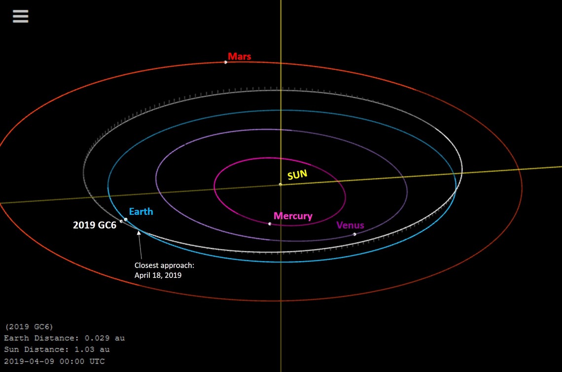 The plot above shows the location of 2019 GC6 relative to Earth's orbit on April 9, 2019, the night of discovery. White arrow indicates 2019 GC6's closest approach to Earth on April 18, 2019. (Modified from NASA/JPL).