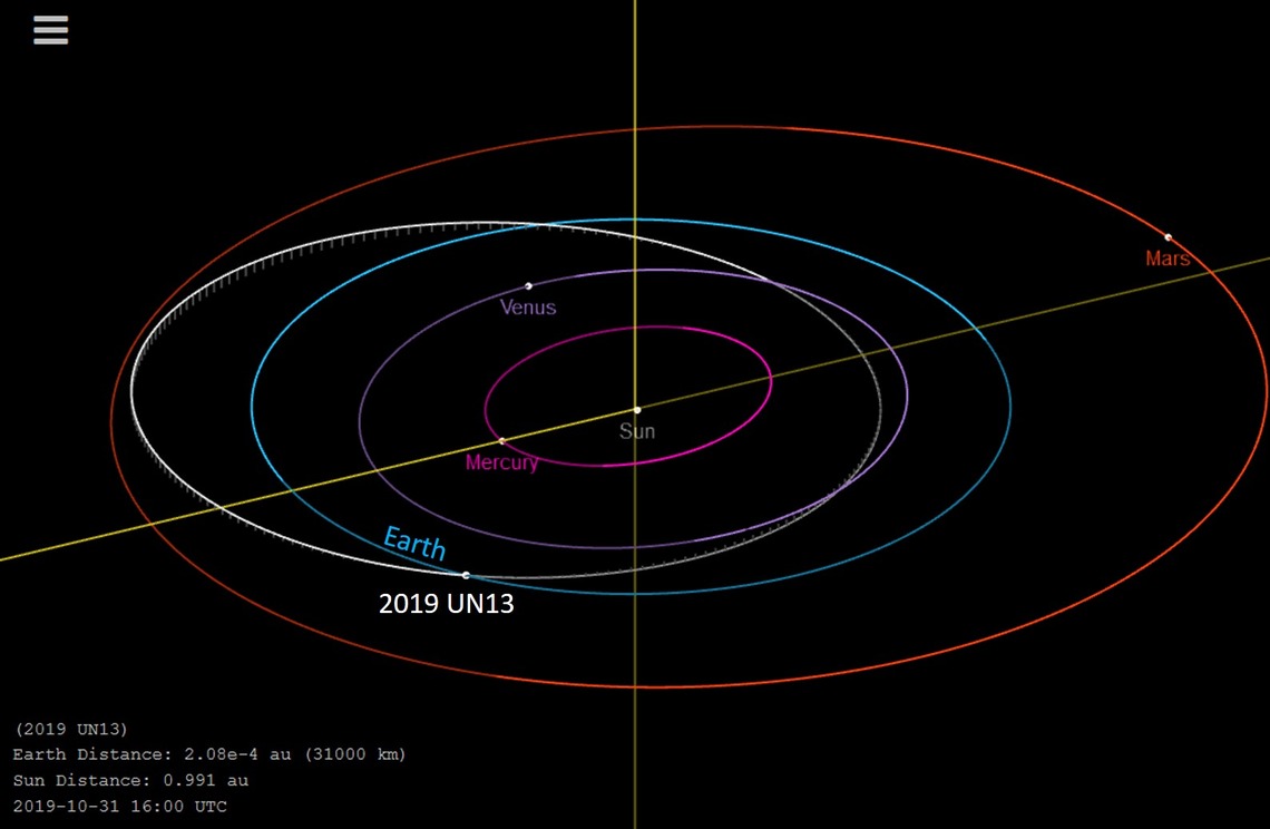 At its closest approach about mid-day on Halloween, 2019 UN13, estimated to be about 3-7 feet across (1-2m), was 3900 miles (6200 km) above Earth’s surface, and only about ten times higher than the top of the atmosphere. Only one other near-Earth object, ‘2011 CQ1’, also discovered by CSS had a slightly closer approach without impacting Earth.