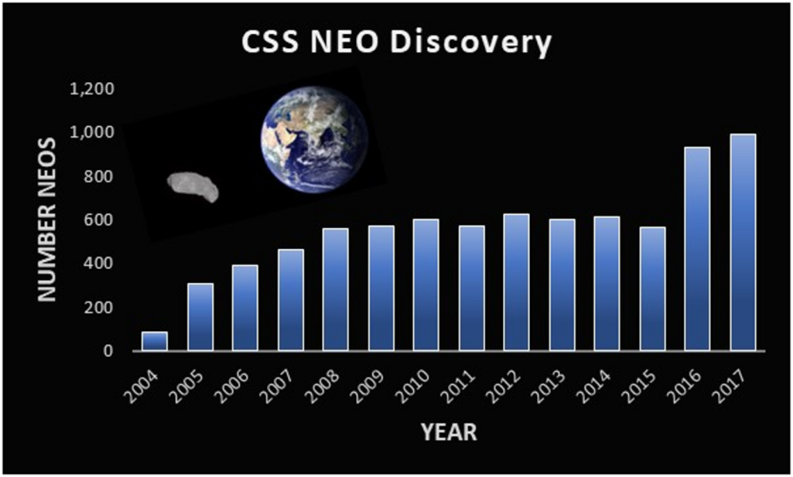The University of Arizona’s Catalina Sky Survey (CSS) has done it again. With a total of 991 newly discovered Near-Earth Objects (NEOs) in 2017, CSS has surpassed their own record and again the all-time record for new NEO discoveries within a calendar year by a single survey program, this in a record year for the larger NEO survey community that collectively discovered more than 2000 NEOs. The NASA-funded Catalina Sky Survey has been a pioneer and leader in NEO surveying and discovery for two decades, and recent upgrades to hardware, software and survey strategies have pushed discoveries to these all-time records.